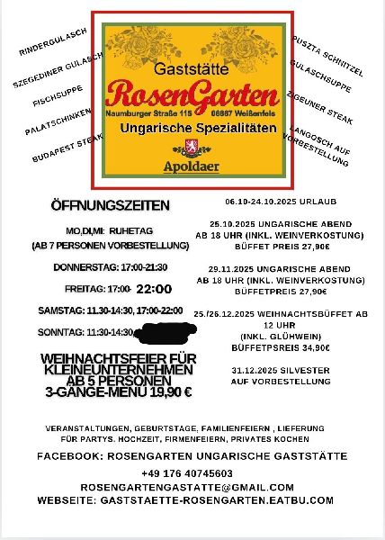 Für Veranstaltungen oder Familienfeiern ab 7 Personen die anderen Tagen sind auch buchbar. Rufen Sie uns gerne an.