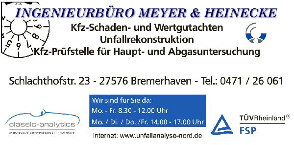 Willkommen bei Ihrem Ingenieurbüro Meyer & Heinecke, das Ihnen als Kfz-Prüfstelle in Bremerhaven zuverlässig bei allen Fragen rund um das Fahrzeug zur Verfügung steht. Bereits seit über 50 Jahren dienen wir unseren Kunden mit großer Expertise, ganz gleich, ob es um Wertgutachten oder die Unfallrekonstruktion geht. Unsere Erfahrung ermöglicht es uns, Probleme sowie Schäden im Detail zu erkennen und festzuhalten, schließlich haben wir schon an den verschiedensten Projekten gearbeitet. Außerdem schulen wir uns regelmäßig weiter, um auch aktuellen Standards stets vollends gerecht zu werden.