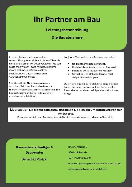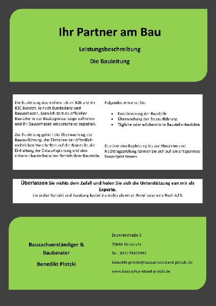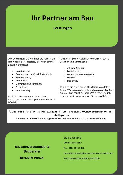 Als Bausachverständiger & Bauberater steht Benedikt Plotzki aus Hohenahr für umfassende Fachkenntnis und neutrale Beratung im Bauwesen. Mit einem Schwerpunkt auf Gutachten und Bauberatung bieten wir unseren Kunden eine kritische und professionelle Unterstützung bei allen Bauthemen. Von der Bauüberwachung bis hin zu detaillierten Bauschadensgutachten – unser Ziel ist es, Bauvorhaben sicherer, effizienter und nachhaltiger zu gestalten.