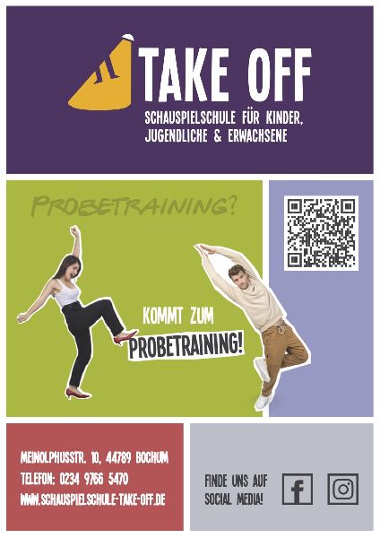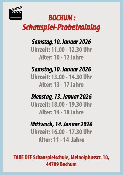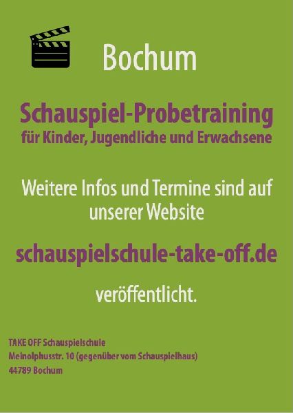 Die TAKE OFF - Schauspielschule für Kinder (ab 9 Jahre), Jugendliche und Erwachsene bietet in wöchentlich fortlaufenden Kursen professionelles Schauspieltraining an. In kleinen Gruppen lernen die Teilnehmer step by step das professionelle Spiel vor der Kamera. Ein Training, das auch in der Schule und später im Berufsleben hilfreich ist. Erfahrene und praxisorientierte Schauspieler*innen geben ihr Wissen an die TAKE OFF-Schüler*innen weiter. Ein Einstieg in die laufenden Kurse, die nach Altersstufen gestaffelt sind, ist jederzeit möglich. Interessierte können sich zu einem unverbindlichen Schauspiel-Probetraining anmelden. Ein intensives Training bieten die Kompakt-Workshops, die in den NRW-Sommerferien den TAKE OFF- Schüler*innen angeboten werden. Themen sind hier beispielsweise Camera Acting, Stimm- und Sprechtraining oder Casting-Vorbereitung. Aufgrund der zentralen Lage und der optimalen öffentlichen Verkehrsanbindung mit Bus & Bahn ist die Schauspielschule TAKE OFF aus allen Richtungen des Ruhrgebiets problemlos zu erreichen.