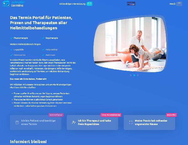 Das Termin Portal für Patienten, Praxen und Therapeuten aller Heilmittelbehandlungen. Patienten, die dringend Hilfe benötigen, warten teils wochenlang auf Termine, um mit ihrer Behandlung beginnen zu können.