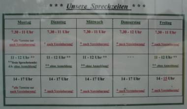 | Dienstag | 07:30 - 11:00, 11:00 - 12:00, 14:00 - 17:00 Uhr |