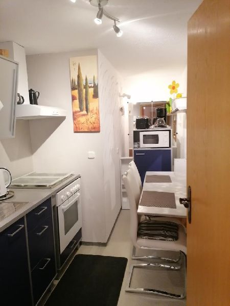 Komplett ausgestattete Küche mit Mikrowelle, Kaffeemaschine, Kühlschrank und Elektrogeräte.