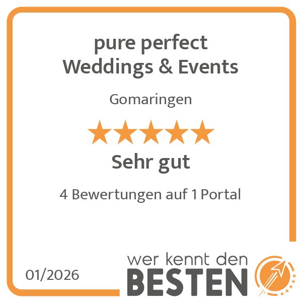 Im Herzen von Gomaringen gelegen, ist pure perfect Weddings & Events Ihr zuverlässiger Partner für Hochzeitsplanung, der jede Feier unvergesslich macht. Unsere Leidenschaft für Perfektion spiegelt sich in jedem Detail wider, von der traumhaften Auswahl an Hochzeitslocations bis hin zu maßgeschneiderten Catering-Lösungen. Unser Ziel: Ihre Traumhochzeit Wirklichkeit werden zu lassen.