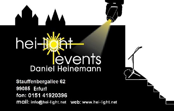 Hei-light Events versteht sich als innovatives Veranstaltungstechnik Unternehmen, das Ihrer Veranstaltung genau das kleine Quentchen Einzigartigkeit gibt, um bei Ihnen und Ihren Gästen für immer im Gedächtnis zu bleiben. Seit Jahren arbeiten wir sowohl für Privatpersonen als auch für Unternehmen im weiteren Umkreis von Erfurt. Unser höchster Anspruch ist es Ihnen alle organisatorischen Sorgen abzunehmen, damit Sie Ihre Feier in vollen Zügen genießen können. Wir würden uns freuen Ihnen eines unserer Veranstaltungskonzepte im persönlichen Gespräch präsentieren zu dürfen! Informationen, wie Sie mit uns in Kontakt treten können, finden Sie auf unserer Homepage www.hei-light.net