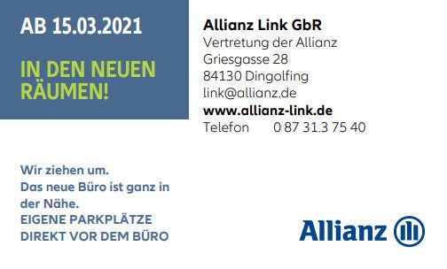 Die Allianz Link GbR in Dingolfing ist Ihre verlässliche Anlaufstelle für Anliegen rund um das Thema Absicherung und Vorsorge. Für unser Team stehen Sie und Ihre Bedürfnisse immer im Mittelpunkt. Ob Sie eine Lebensversicherung abschließen möchten oder eine lukrative Geldanlagemöglichkeit suchen, macht für uns dabei keinen Unterschied. Wir achten Ihnen gegenüber zudem auf größtmögliche Transparenz. Schließlich wissen wir, dass sich nur mit gegenseitigem Vertrauen ideale Lösungen finden lassen.