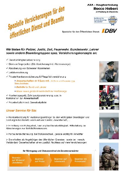Die DBV Deutsche Beamtenversicherung Rocco Hebert in Freiberg ist ihr Ansprechpartner für den öffentlichen Dienst, Dienstanfänger/Beamtenanwärter, Beamte auf Probe/Widerruf/Lebenszeit in Freiberg und Mittelsachsen. Wir sind Spezialist für den öffentlichen Dienst in Freiberg und beraten Sie zur freien Heilfürsorge und spezieller Dienstunfähigkeitsabsicherung für Polizei, Feuerwehr, Soldaten, Justiz- und Zollbeamte. Wir bieten zudem eine Dienstanfängerberatung zur kleinen und Großen Anwartschaftsversicherung zu Ihrer Heilfürsorge an. Außerdem beraten wir Lehrer, Lehramtsanwärter und Beamte in Sachsen zur DBV Beihilfeversicherung. Wir beraten Sie auf Wunsch auch gerne auch Online!