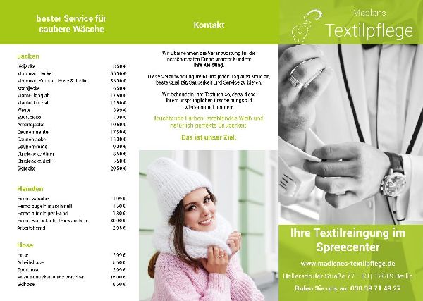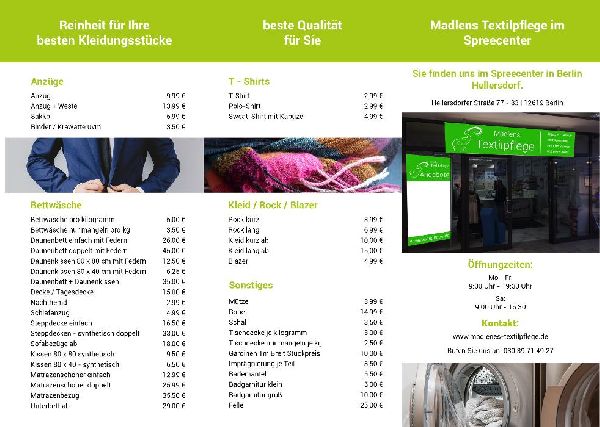 Wir befinden uns im Spreecenter in Berlin Hellersdorf und bieten Ihnen die Reinigung jeglicher Textilien sowie Leder, Felle und Teppiche.